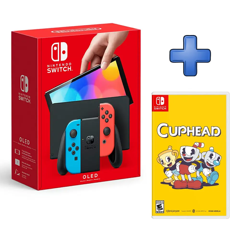 Consola Nintendo Switch OLED (Neon): Estilo atrevido y moderno. La pantalla OLED de 7 pulgadas ofrece un contraste y una viveza de color que harán que los detalles dibujados a mano de Cuphead cobren vida de una manera que ninguna otra pantalla puede igualar.